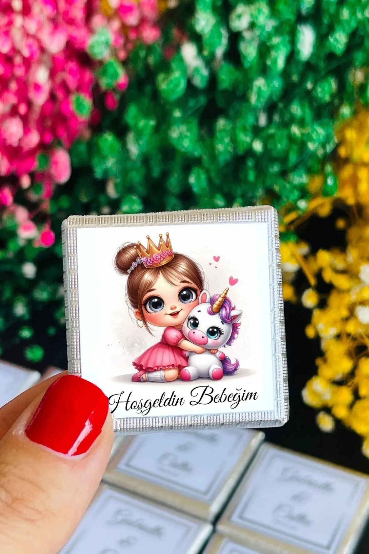 Yüksek kaliteli kuşe kağıt üzerine canlı renklerle basılmış bu kare çikolata etiketleri, arka yüzeylerinde yer alan yapışkan (sticker) özelliği sayesinde çikolatalara ve küçük yüzeylere kolayca yapıştırılabilir.